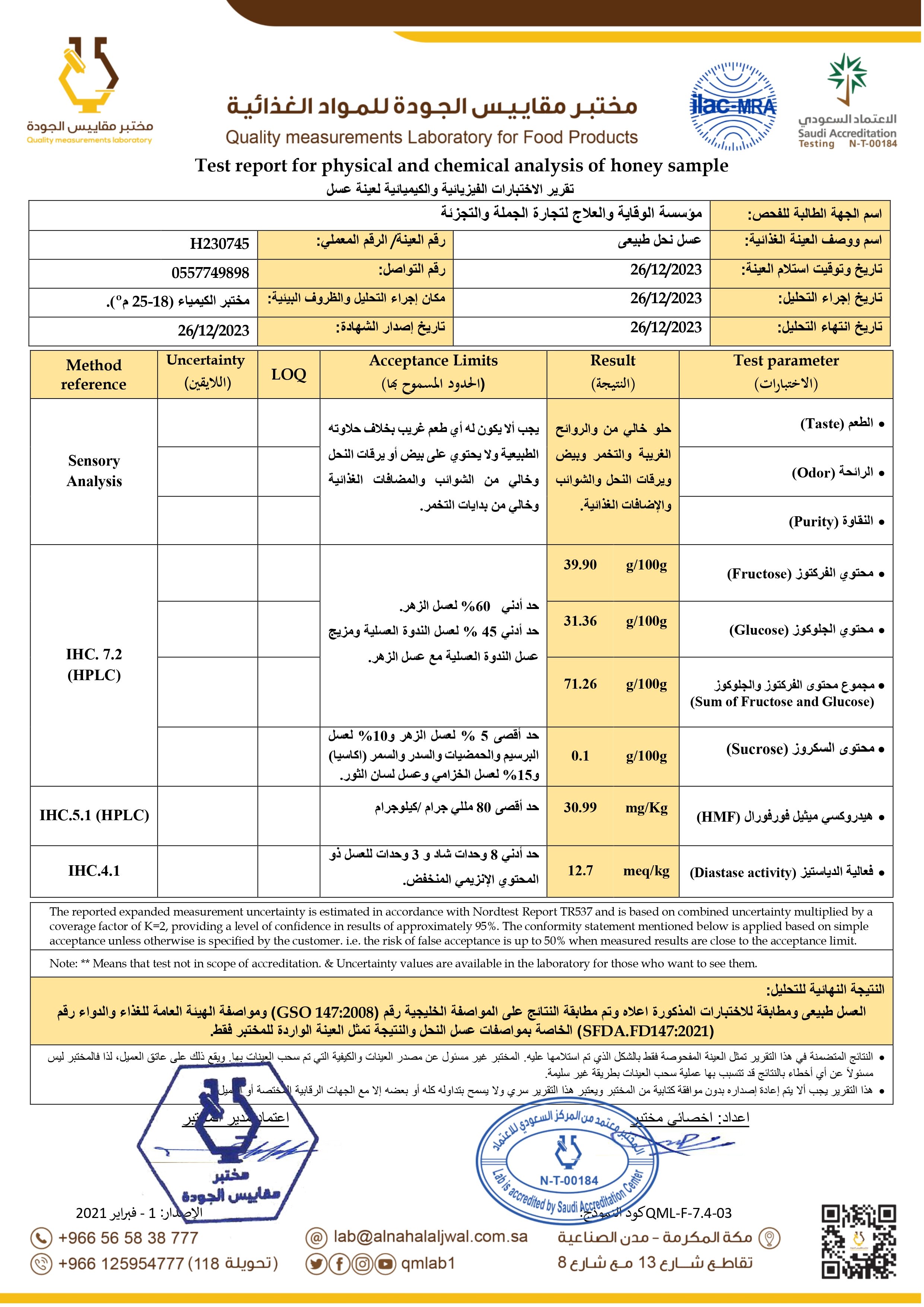 مرفق لكم شهادة فحص العسل من مختبر معتمد في المملكة، بإسم مؤسسة الوقاية